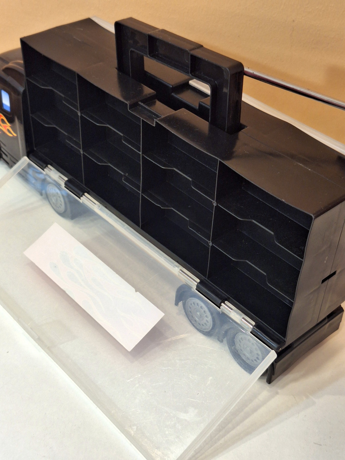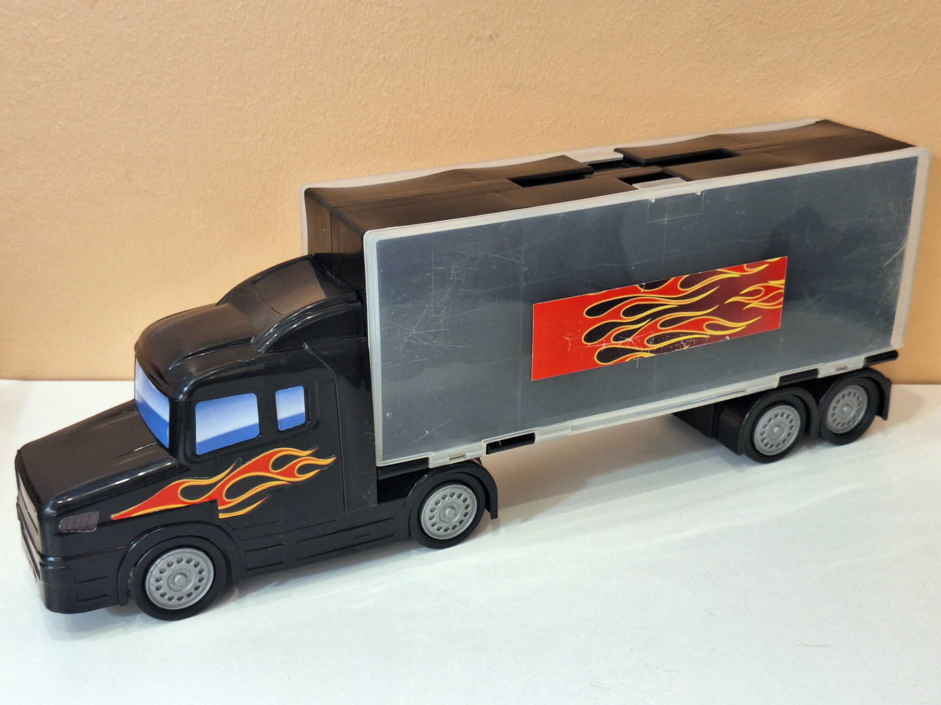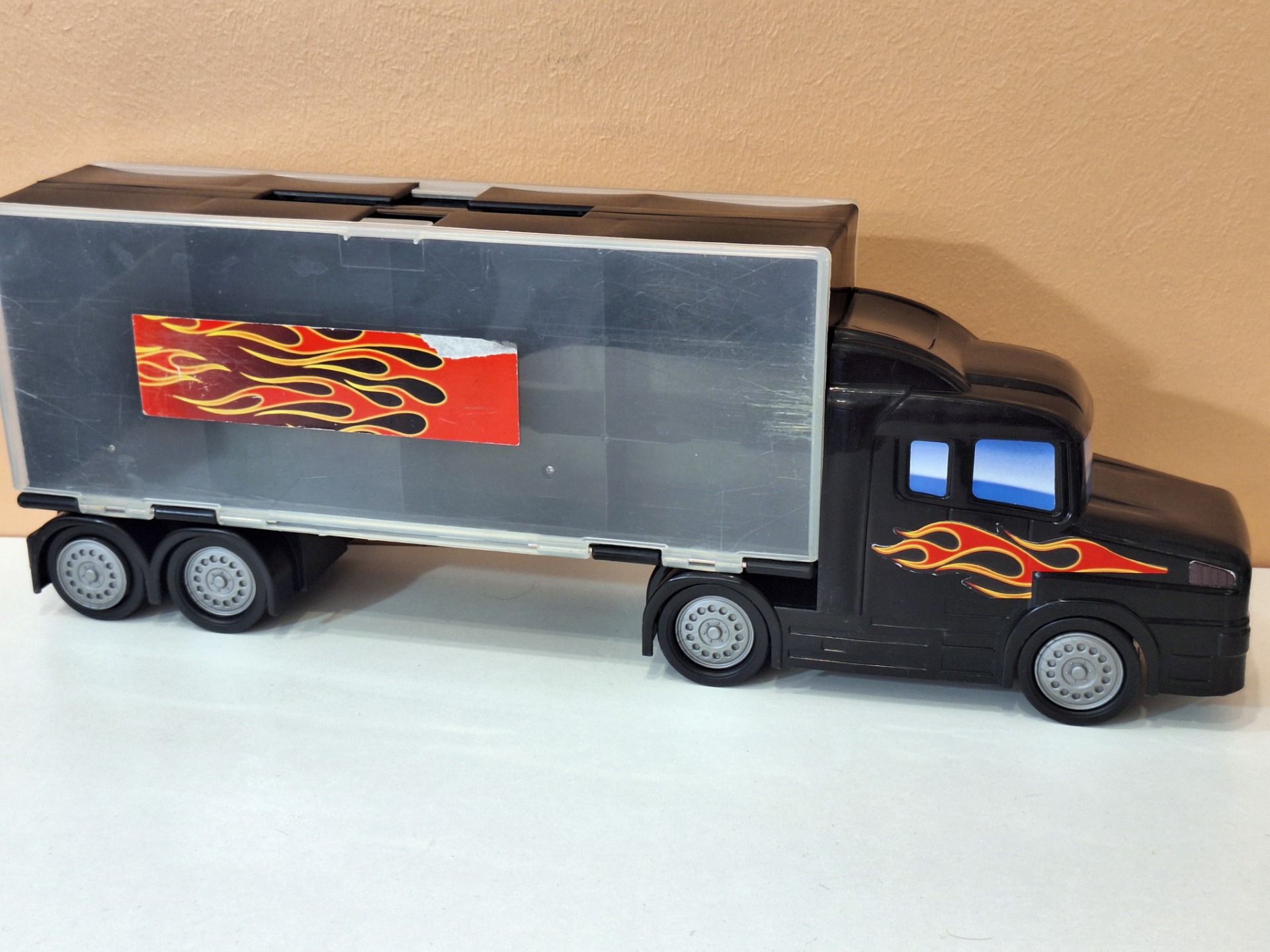 Iso pikkuautojen kuljetusrekka. Ehjä leikitty kunto. Mitat 48 x 17 x 9 cm.