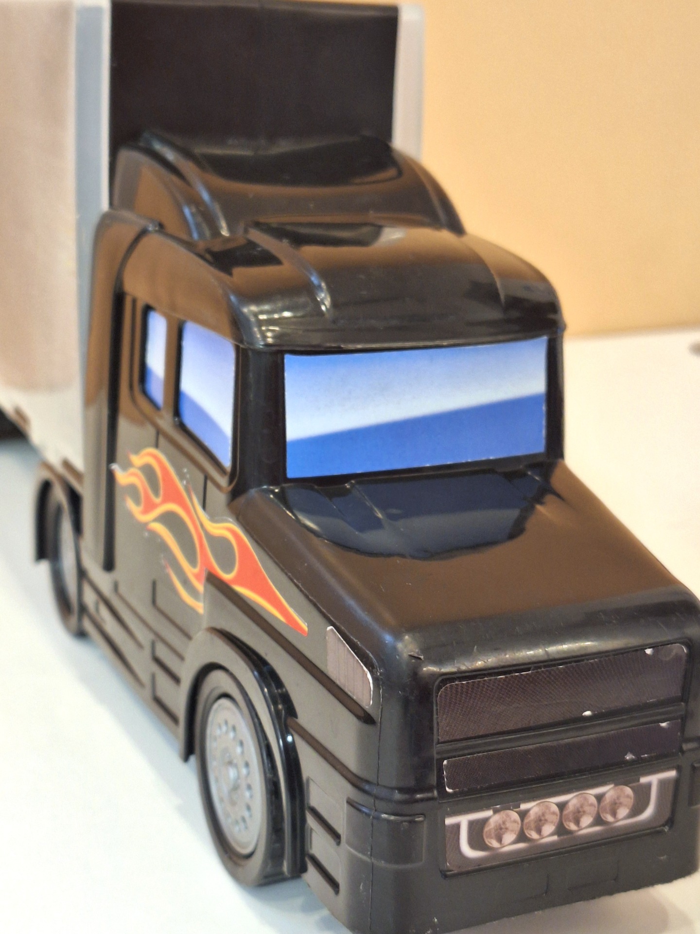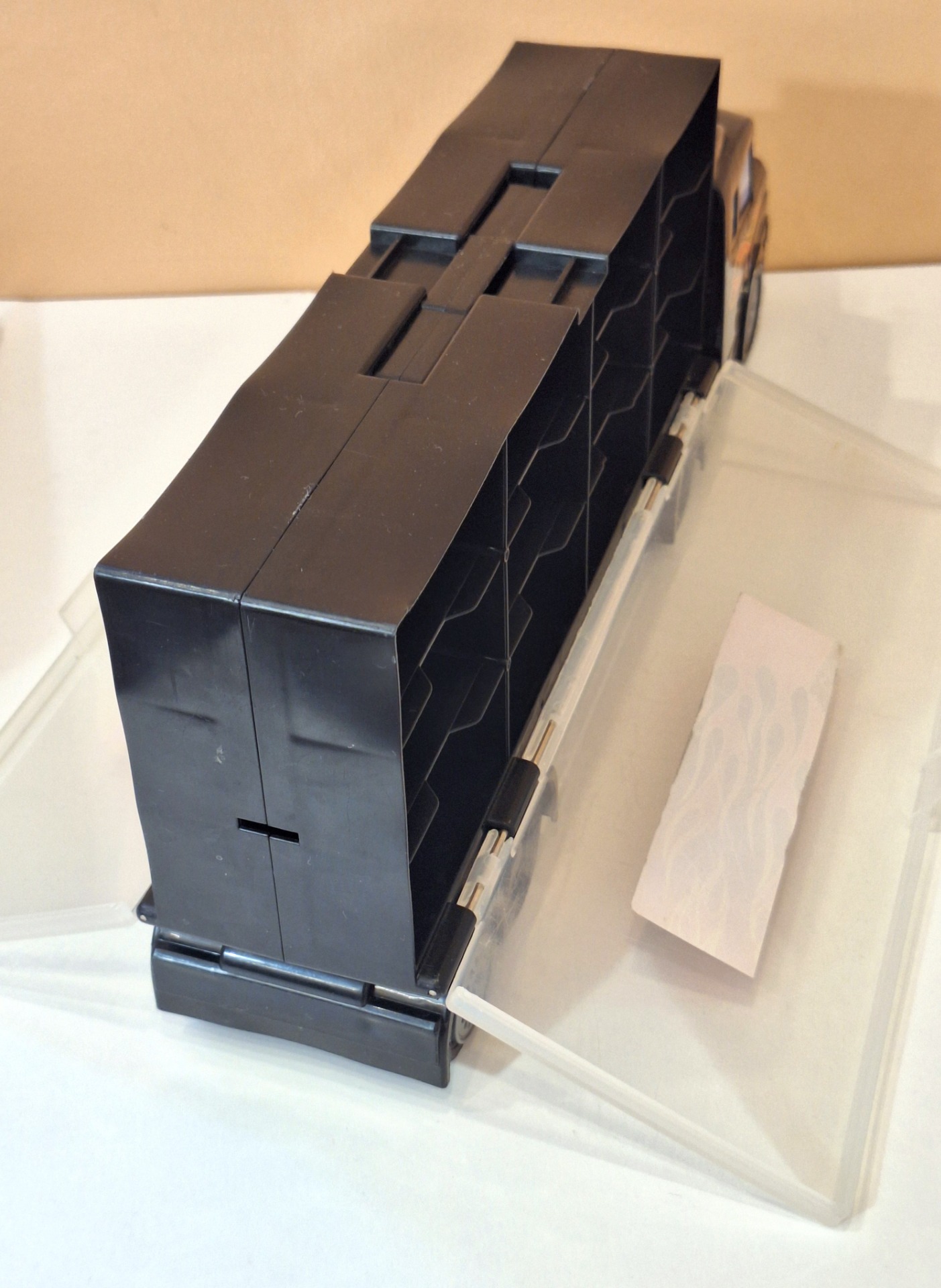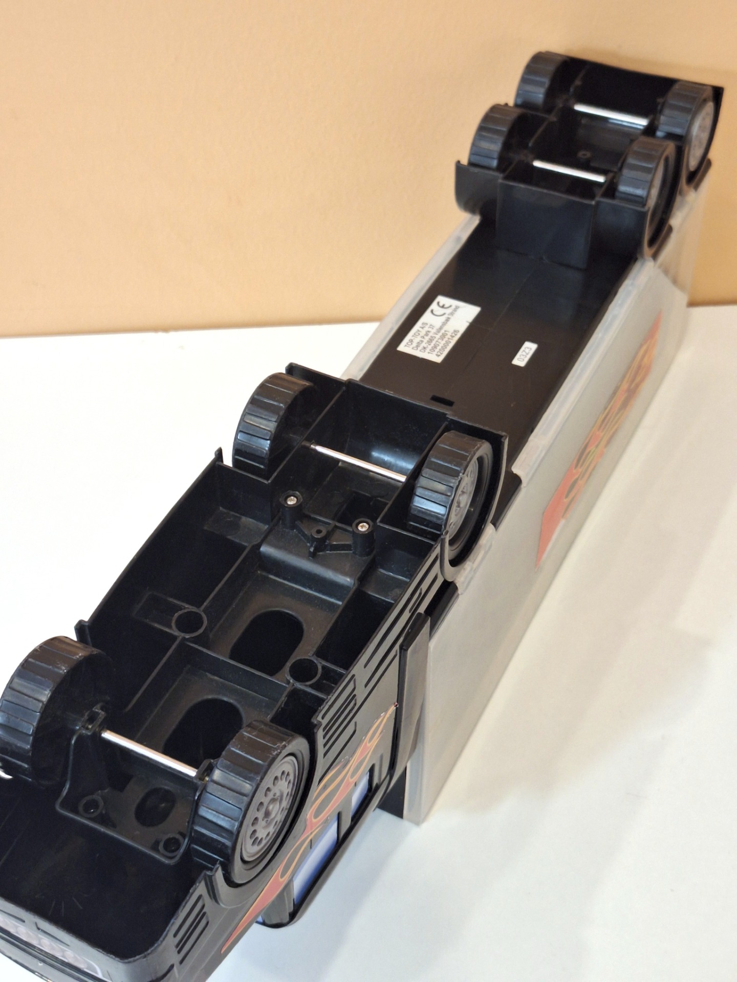 Iso pikkuautojen kuljetusrekka. Ehjä leikitty kunto. Mitat 48 x 17 x 9 cm.