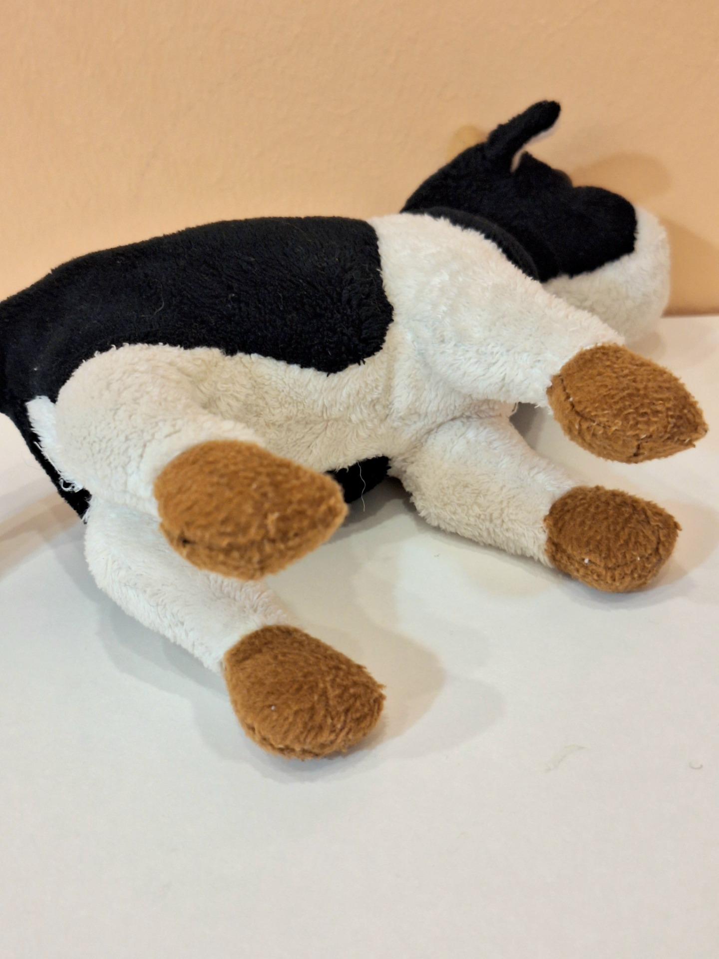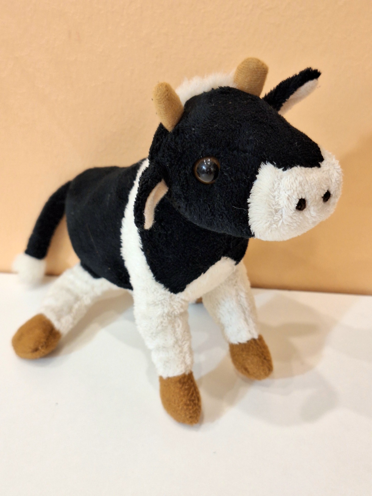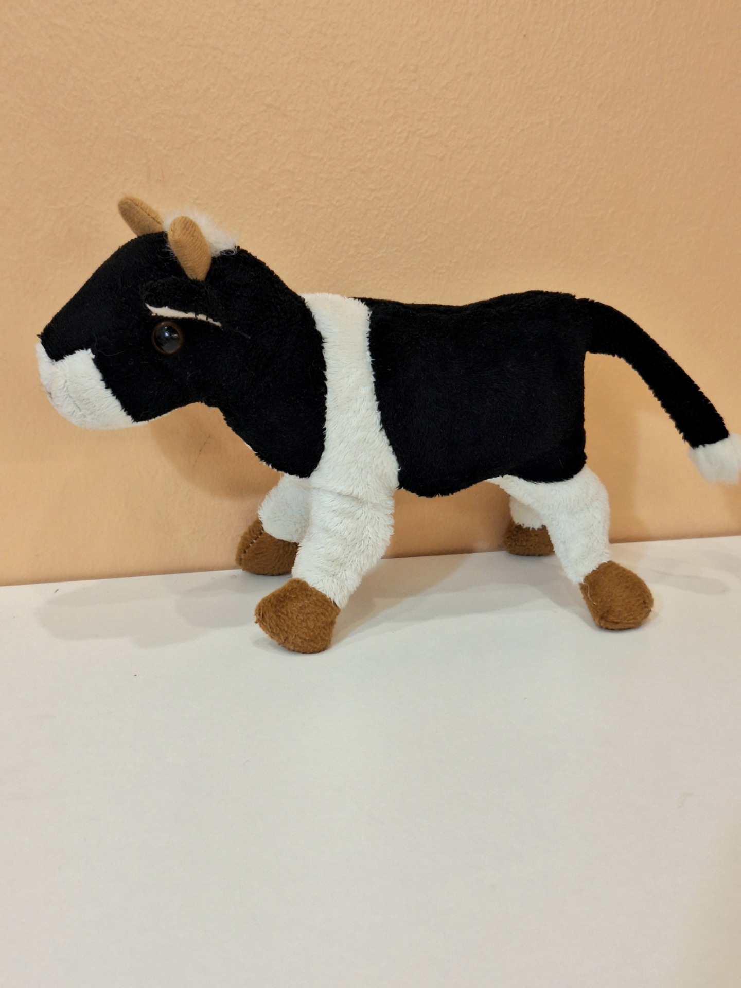Lehmä pehmolelu. Ehjä leikitty kunto. Pituus noin 22 cm. Laput leikattu.
