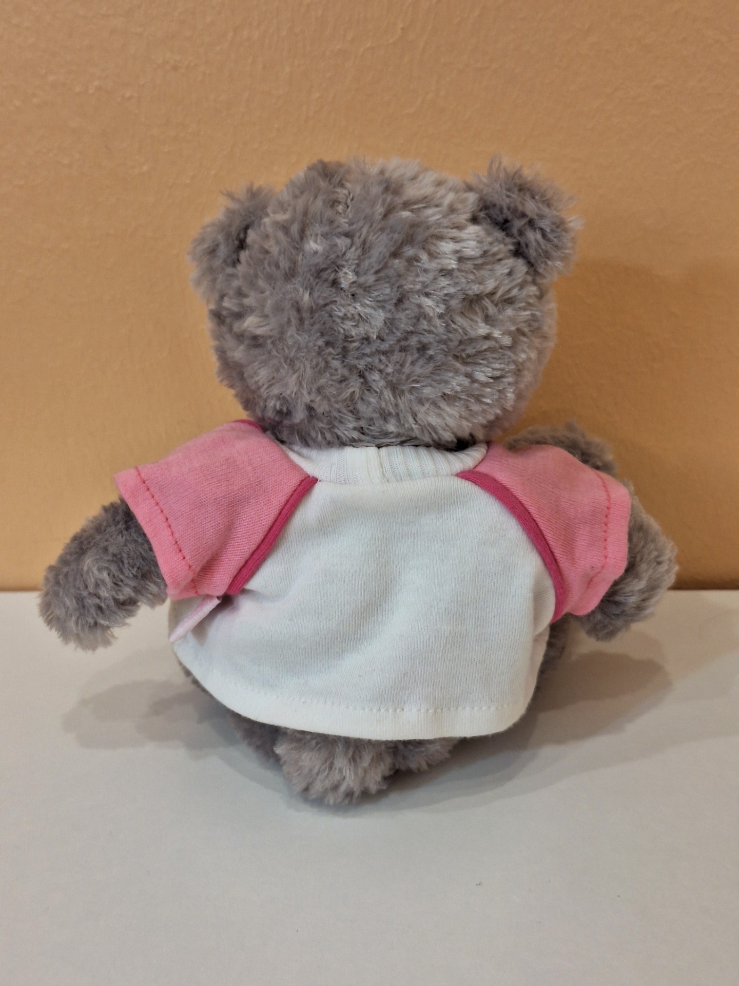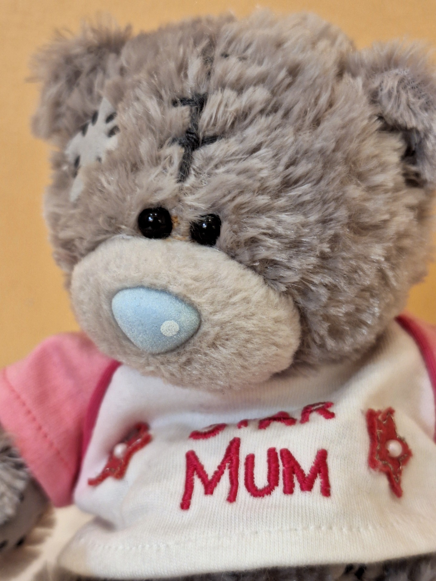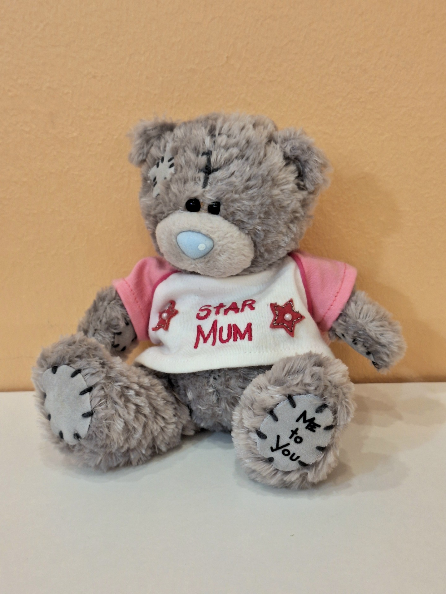 Istuva nalle pehmolelu riisuttavalla paidalla. Paidassa teksti "star mum" Ehjä leikitty kunto. Korkeus noin 14 cm.