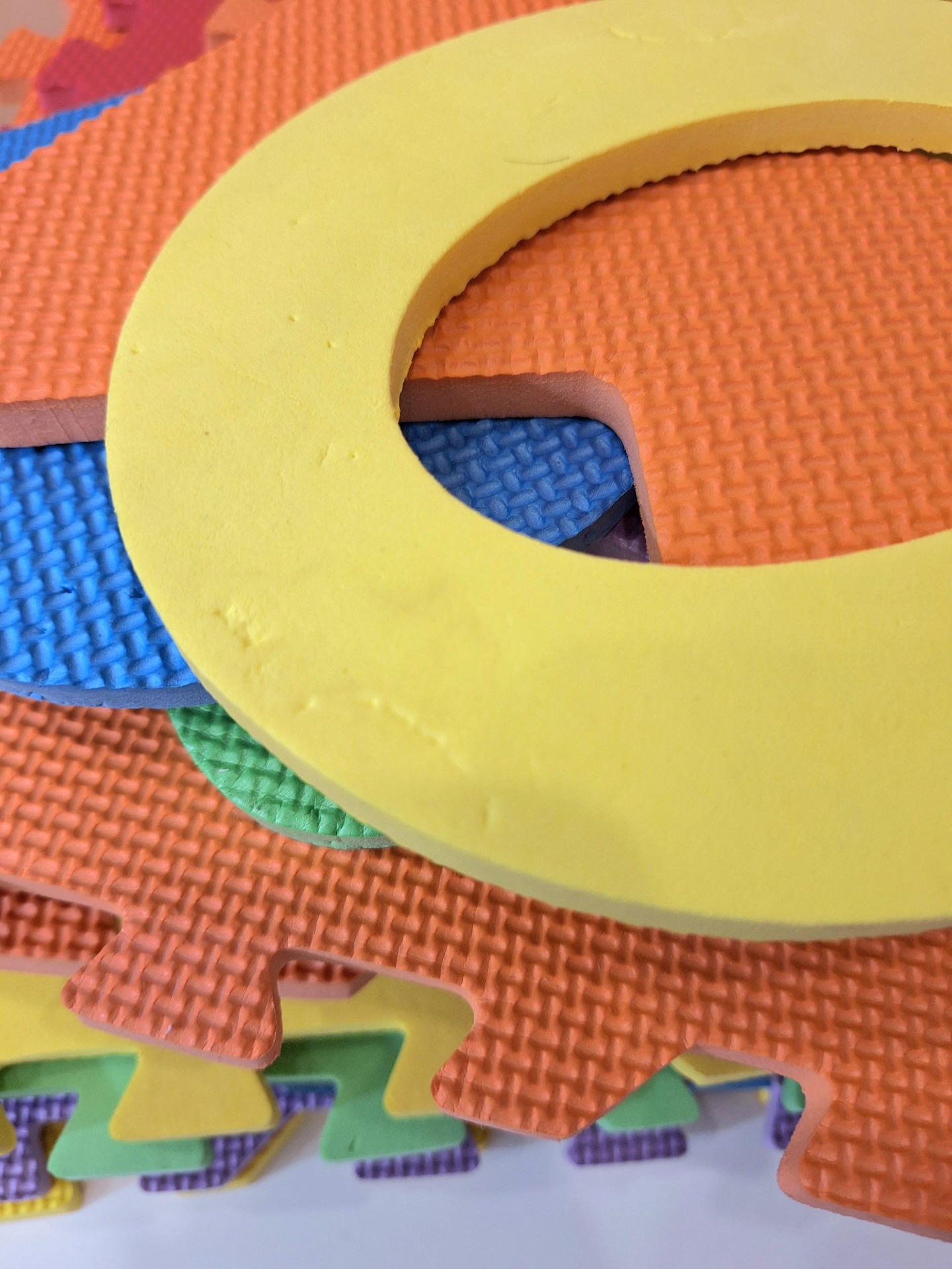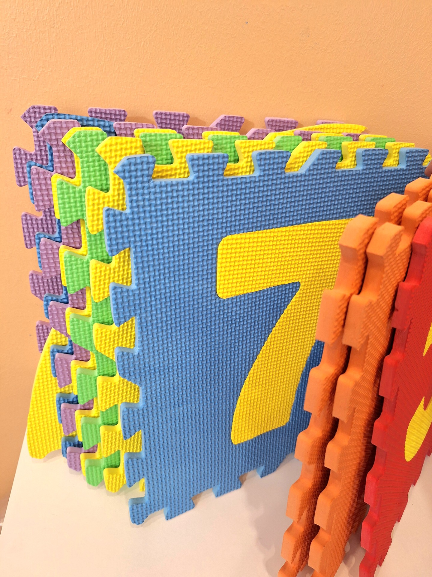 Pehmopalapeli. Ehjä leikitty kunto. Muutamissa paloissa hampaanjäljet. Yhden palan koko 32,5x32,5 cm. Kahdeksikon yksi pala puuttuu.