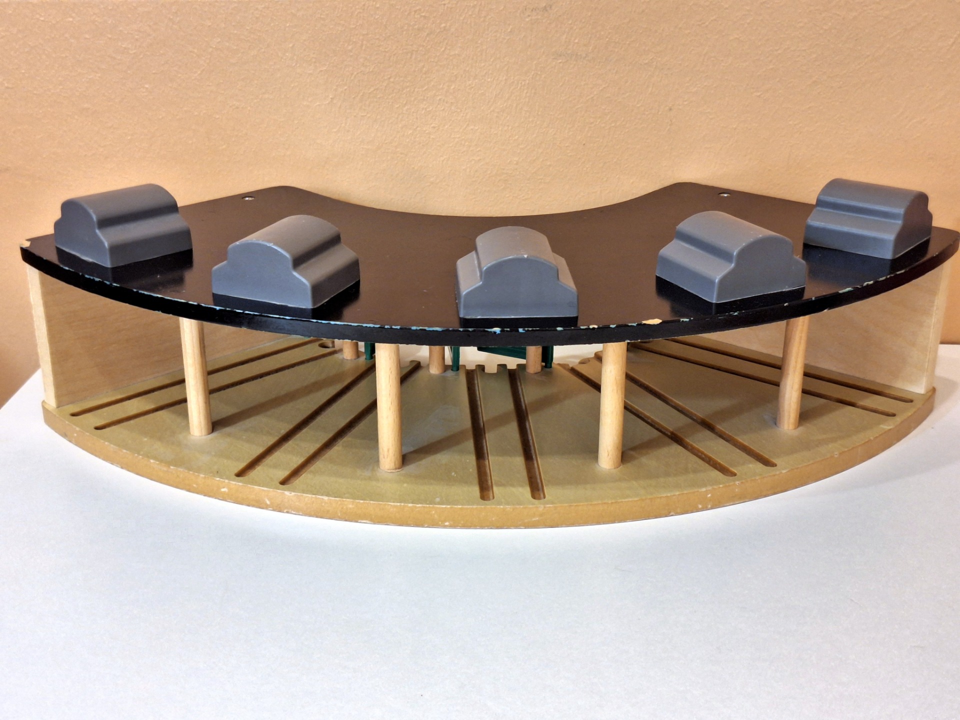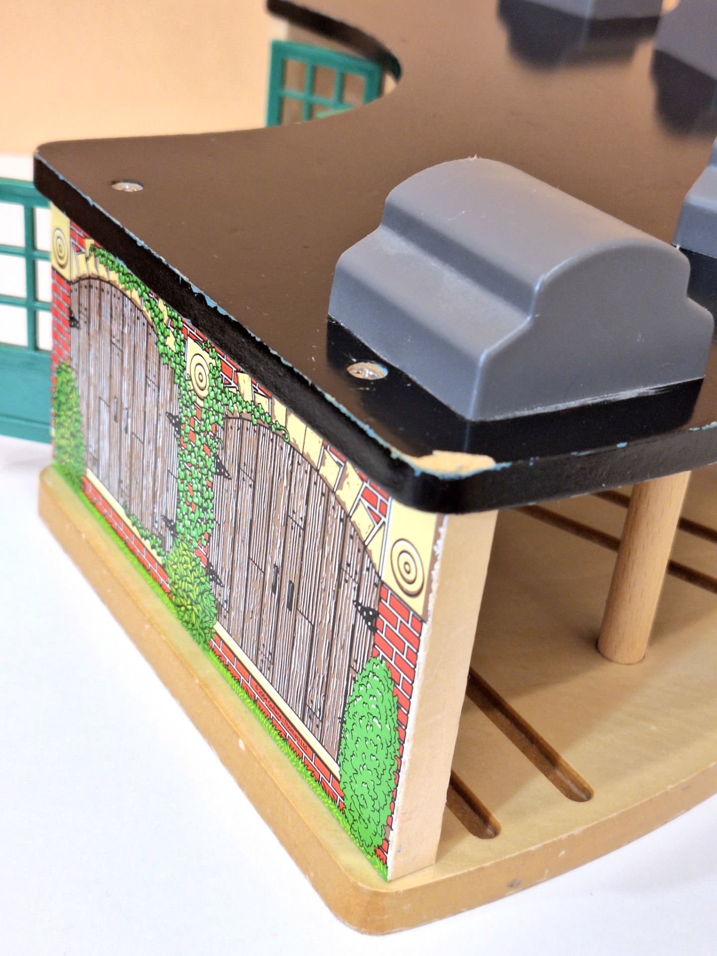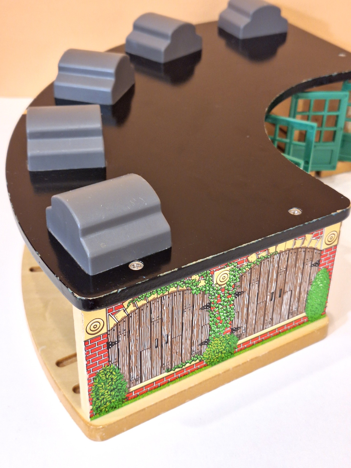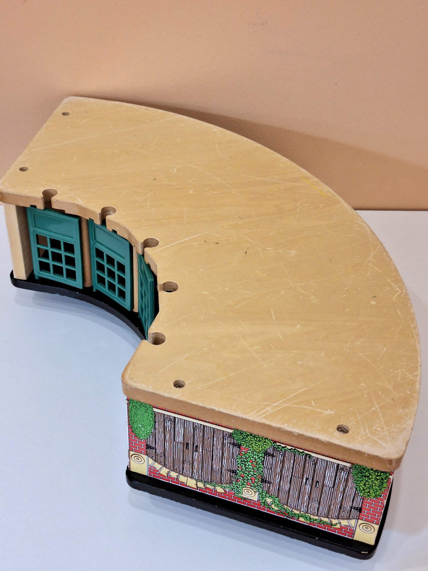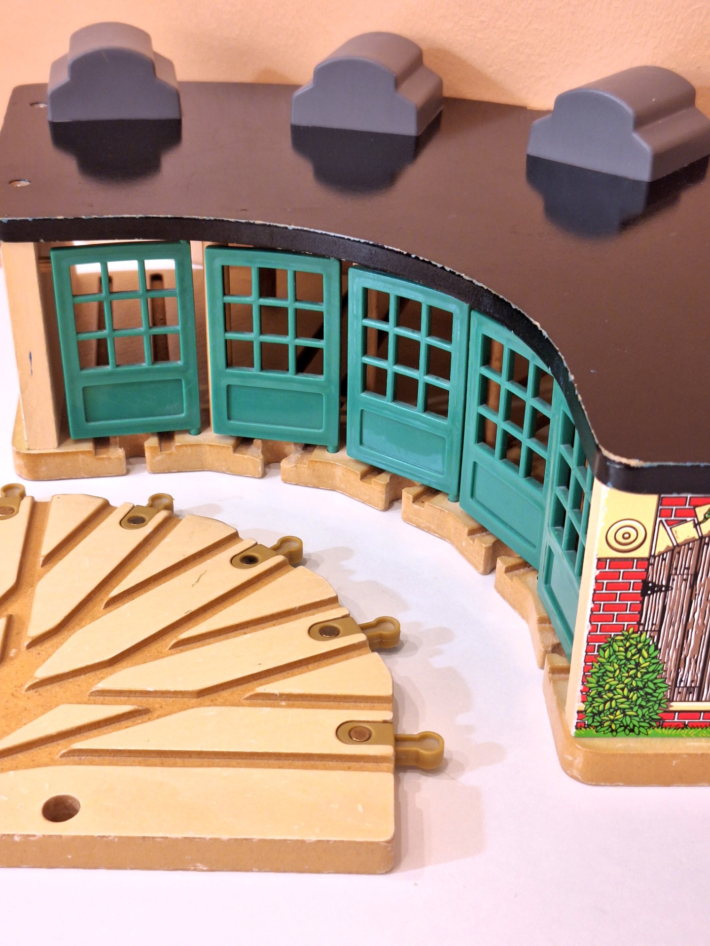 Puinen Thomas and Friends Roundhouse junatalli. Ehjä leikitty kunto. Koko noin 53 x 27 x 14 cm. Yhteensopiva Brio junaratojen kanssa.